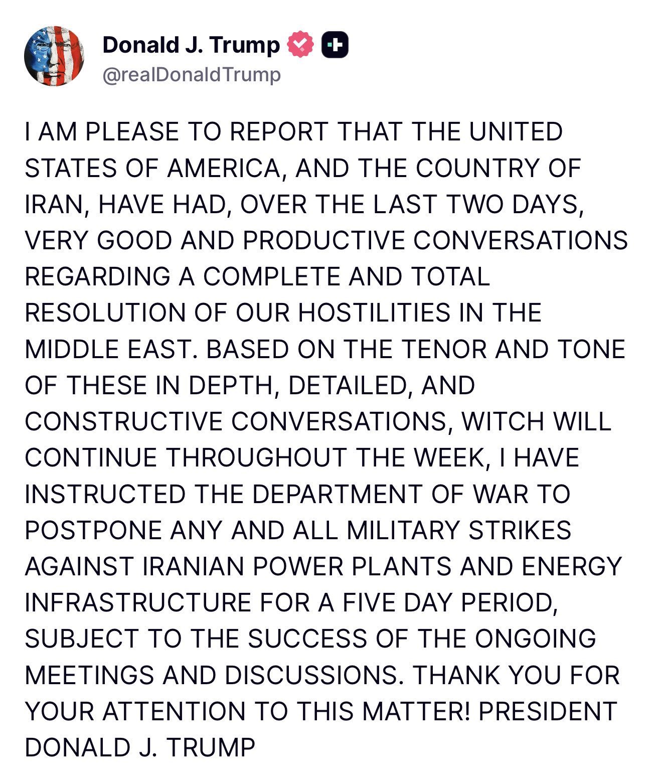 Претседателот на САД, Donald Trump, објави дека американската војска ќе ги одложи планираните напади врз иранската енергетска инфраструктура за период од пет дена, по неодамнешни разговори со Техеран.
